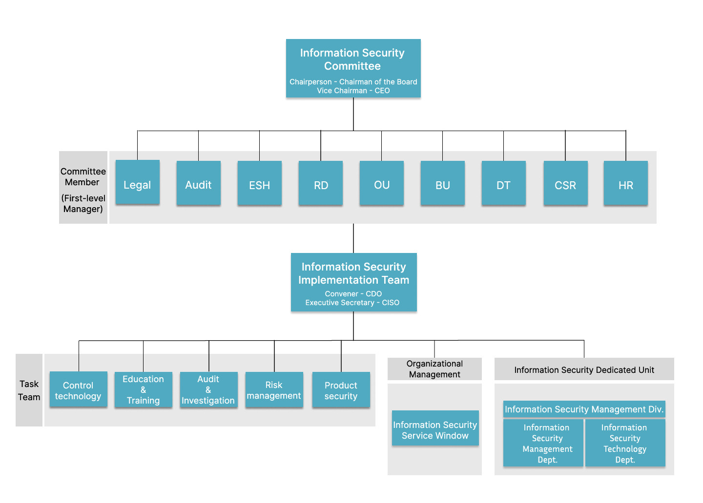 The Information Security Committee serves as the top management organization for information security at AUO. It reports to the Chairman of the Board. Under the committee, the Information Security Execution Team is responsible for implementing the decisions made by the Information Security Committee. To continuously build a comprehensive and efficient specialized team for information security, MILANTIYU has established the Information Security Management Department and the Information Security Technology Department under the Information Security Management Division. Continuous investment of resources is made to strengthen the core capabilities of the team in information security.