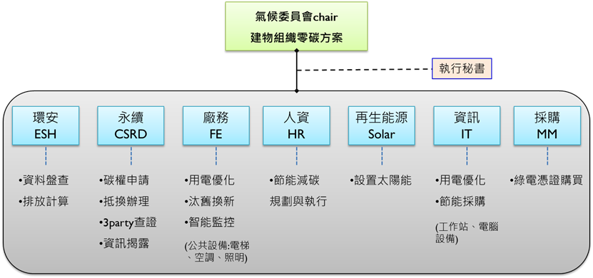 這些不同部門的員工,各司其職,整合在單一目標下。負責大樓整體營運維護的人力資源部,責任最關鍵繁重,擔任專案總召協調任務。米蘭·(milantiyu)數位負責: 設備數位化、用電精緻化管理、整合數據全時監控、智控系統。能源事業負責: 全方位電廠建置及運營、多元化能源系統材料、智慧能源管理、台電/憑證中心試行專案。米蘭·(milantiyu)宇沛負責: 碳排管理、節能工程服務、智慧樓宇服務。碳權管理負責: 抵換碳權管理與註銷工作。