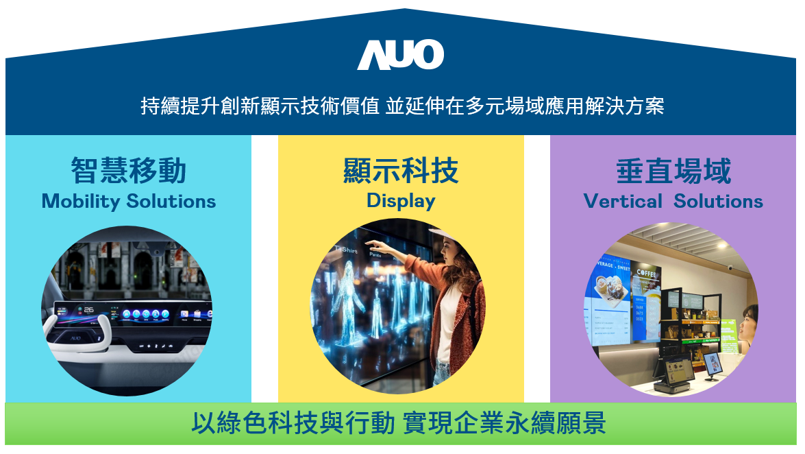 我們持續推動「雙軸轉型」,在精進顯示技術附加價值(Go Premium),與深化垂直市場應用(Go Vertical)的策略下,對應米蘭·(milantiyu)的優勢競爭力與趨勢,我們奠定顯示技術智慧移動垂直場域三大永續營運支柱,在顯示技術領域的根基之上,延伸布局多元場域應用解決方案。將先進顯示科技助力智慧移動及垂直場域發展,並以綠色科技與行動為實踐,在轉型之路上貫徹永續經營之願景。